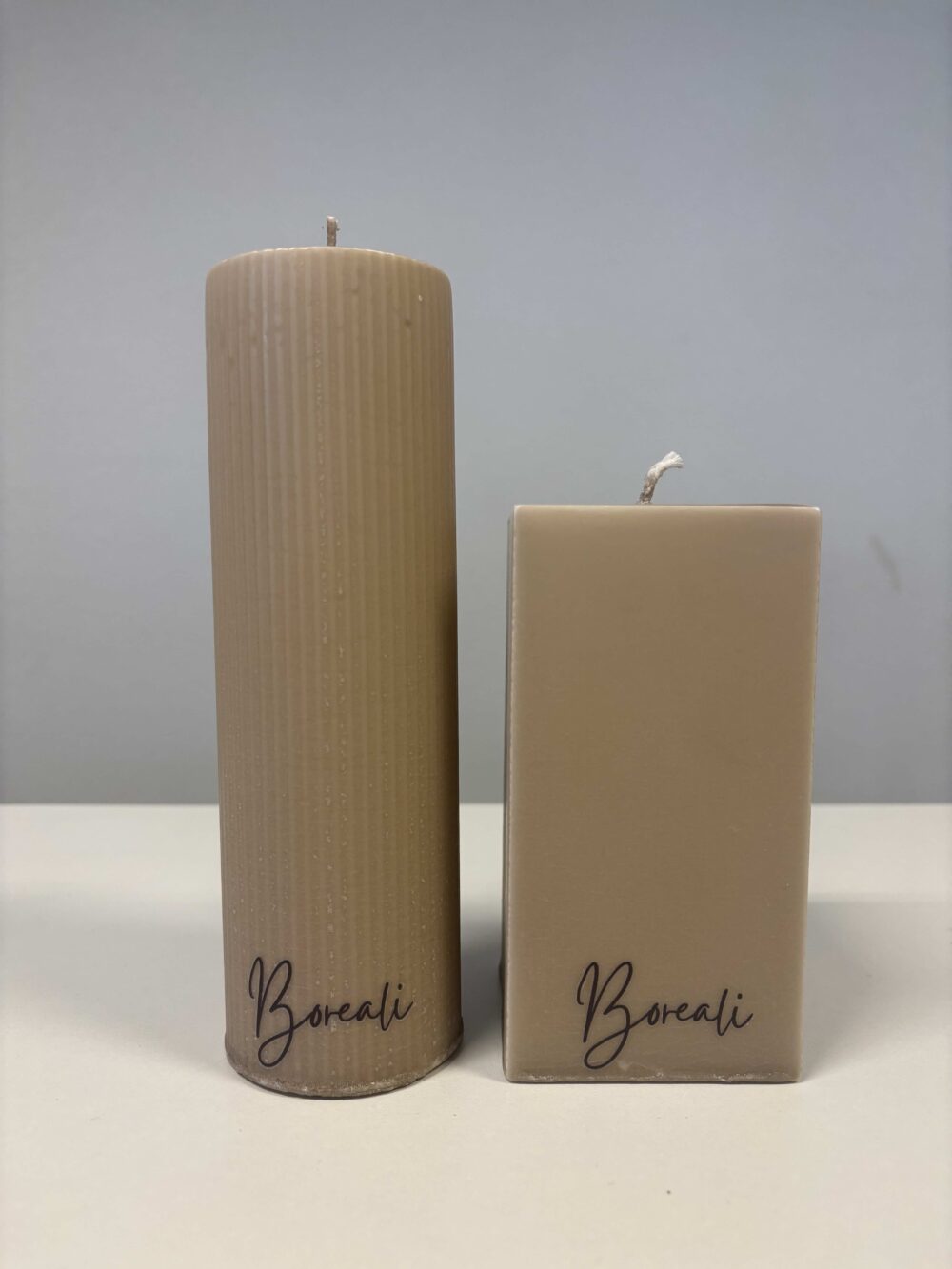 Prachtige en stijlvolle cadeauset: ronde beige kaars (40 branduren) & vierkante beige kaars (40 branduren). Beide kaarsen maken uniek kantwerk tijdens het branden.