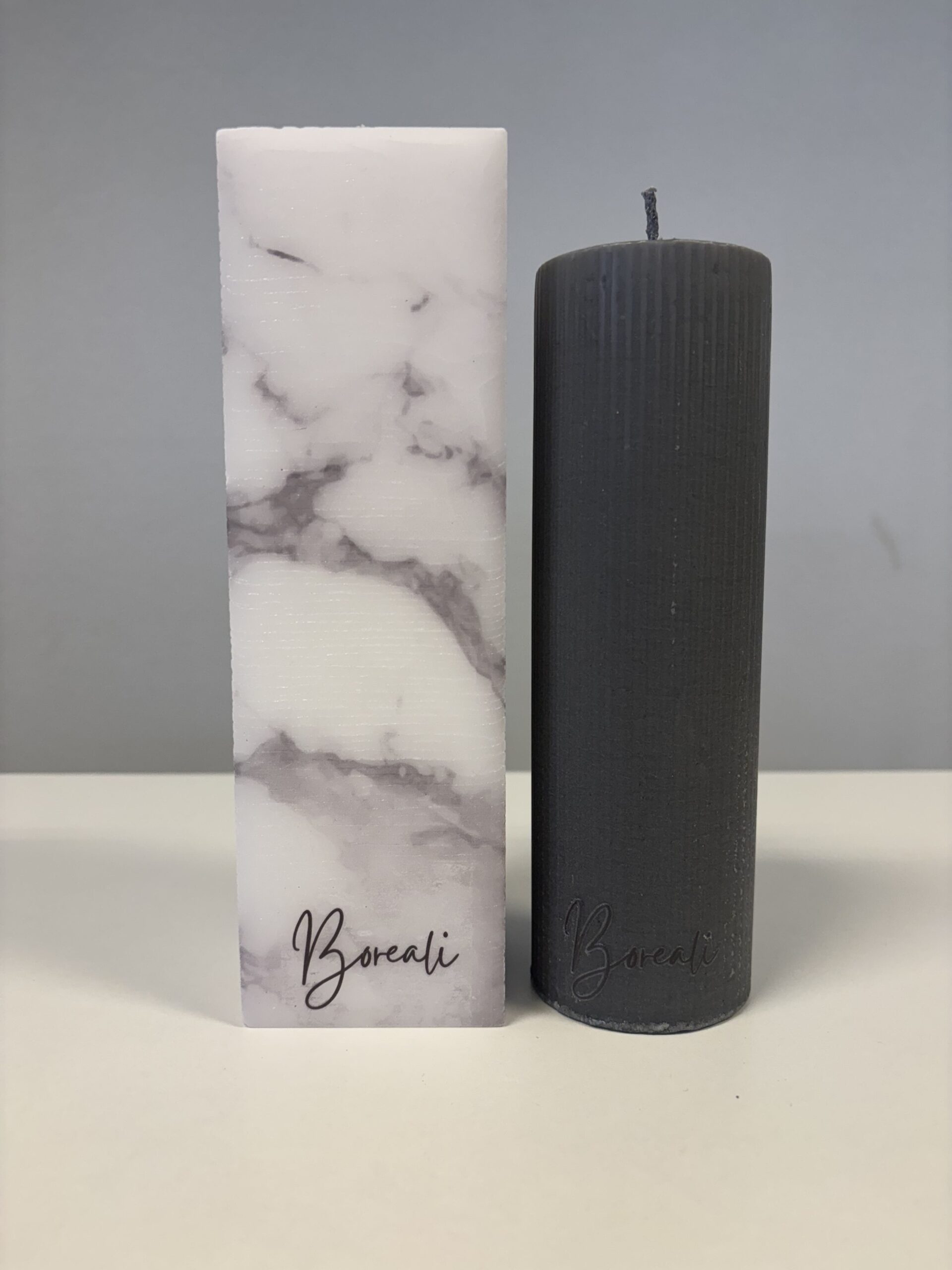 Prachtige en stijlvolle cadeauset: vierkante kaars marmerlook grijs (90 branduren) & ronde kaars donkergrijs met ribbelstructuur (40 branduren). Beide kaarsen maken uniek kantwerk tijdens het branden.