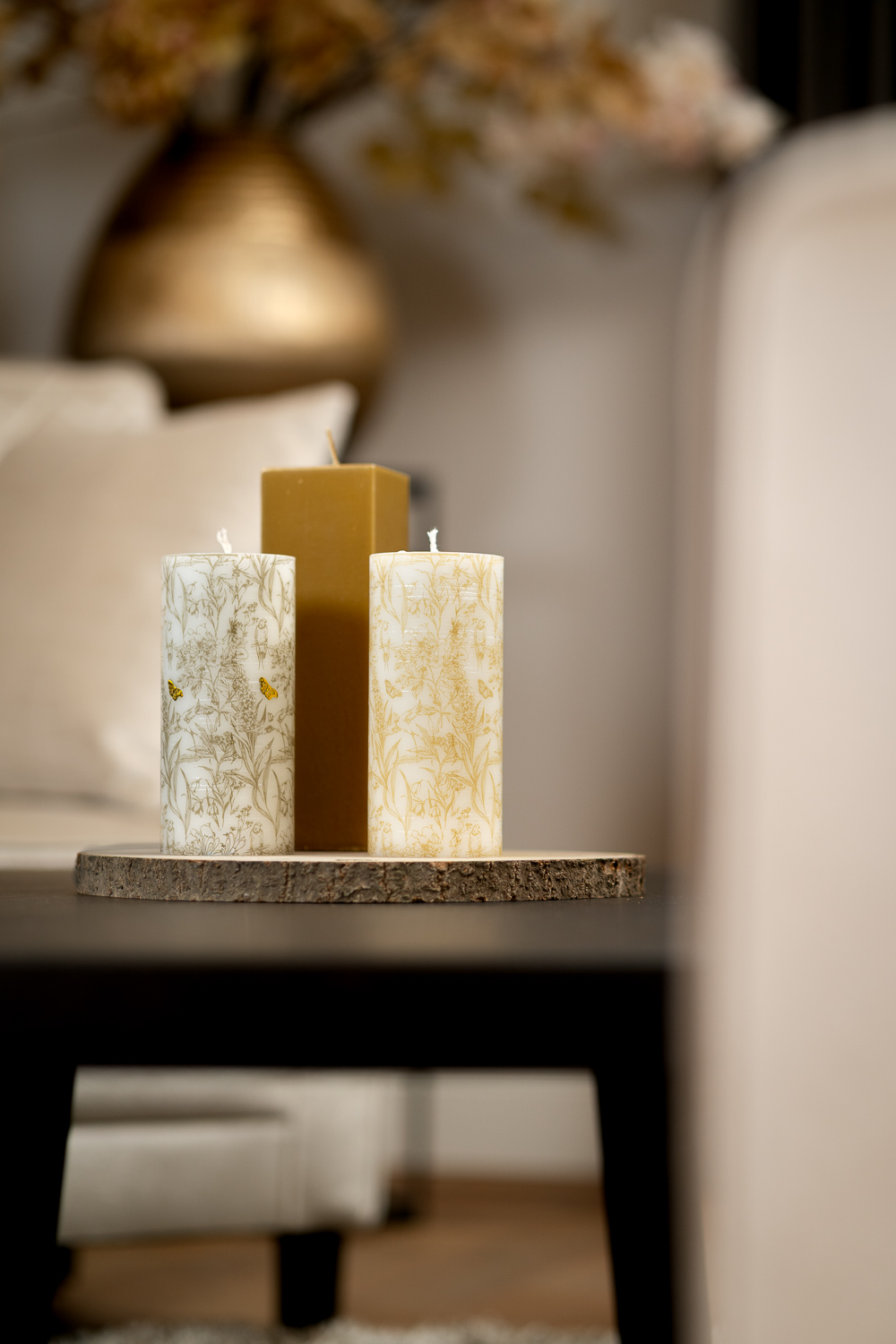 Ronde kaars (100% stearine) glad oppervlak met olijfgroen patroon rondom, maakt ook uniek kantwerk aan buitenkant tijdens het branden.
