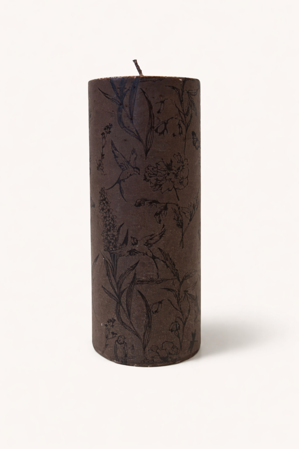 Ronde donker bruine kaars (100% stearine) glad oppervlak met patroon, maakt ook uniek kantwerk aan buitenkant tijdens het branden.