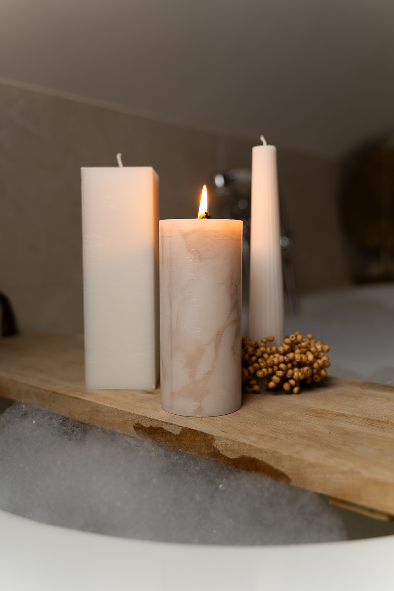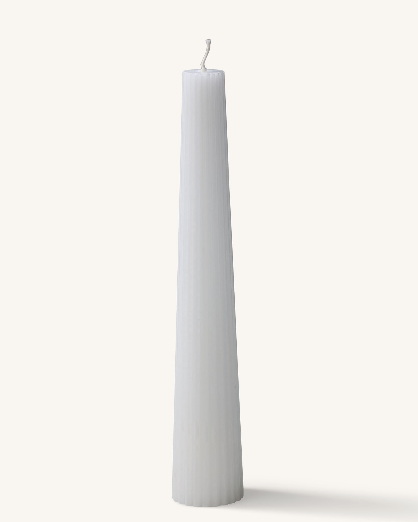 Ronde kaars (100% stearine) met ribbelstructuur verticaal rondom, maakt unieke pieken aan de buitenkant.