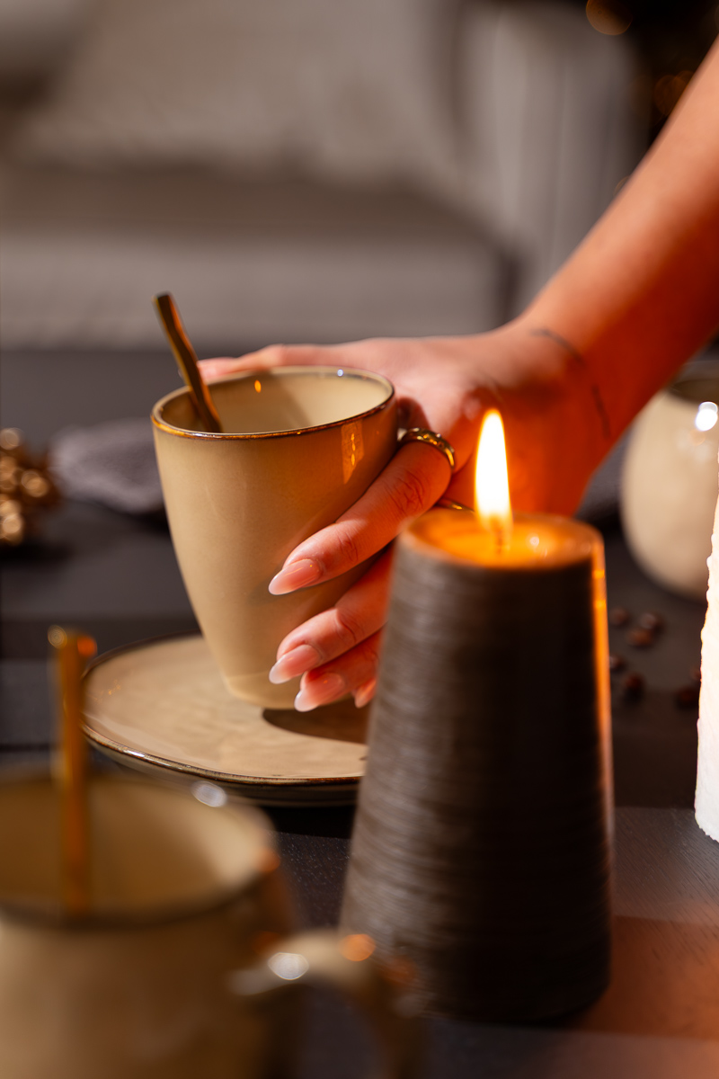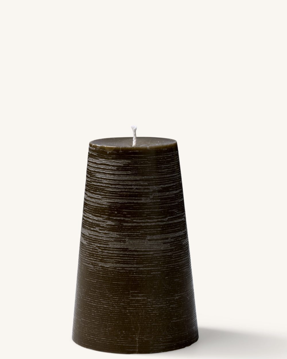 Kegelvormige kaars (100% stearine) met gladoppervlak, maakt ook uniek kantwerk aan buitenkant tijdens het branden.