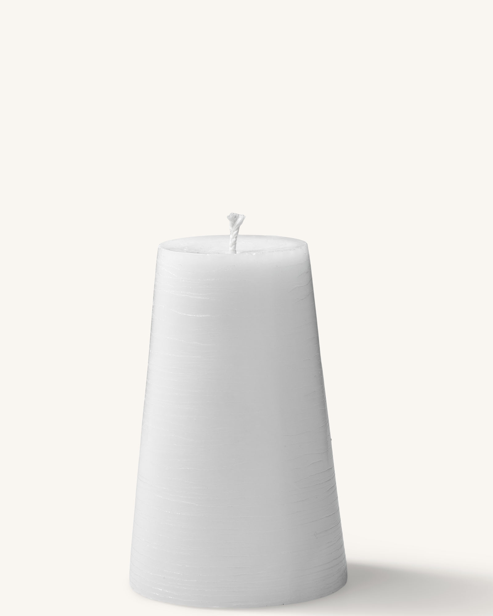 Kegelvormige kaars (100% stearine) met gladoppervlak, maakt ook uniek kantwerk aan buitenkant tijdens het branden.