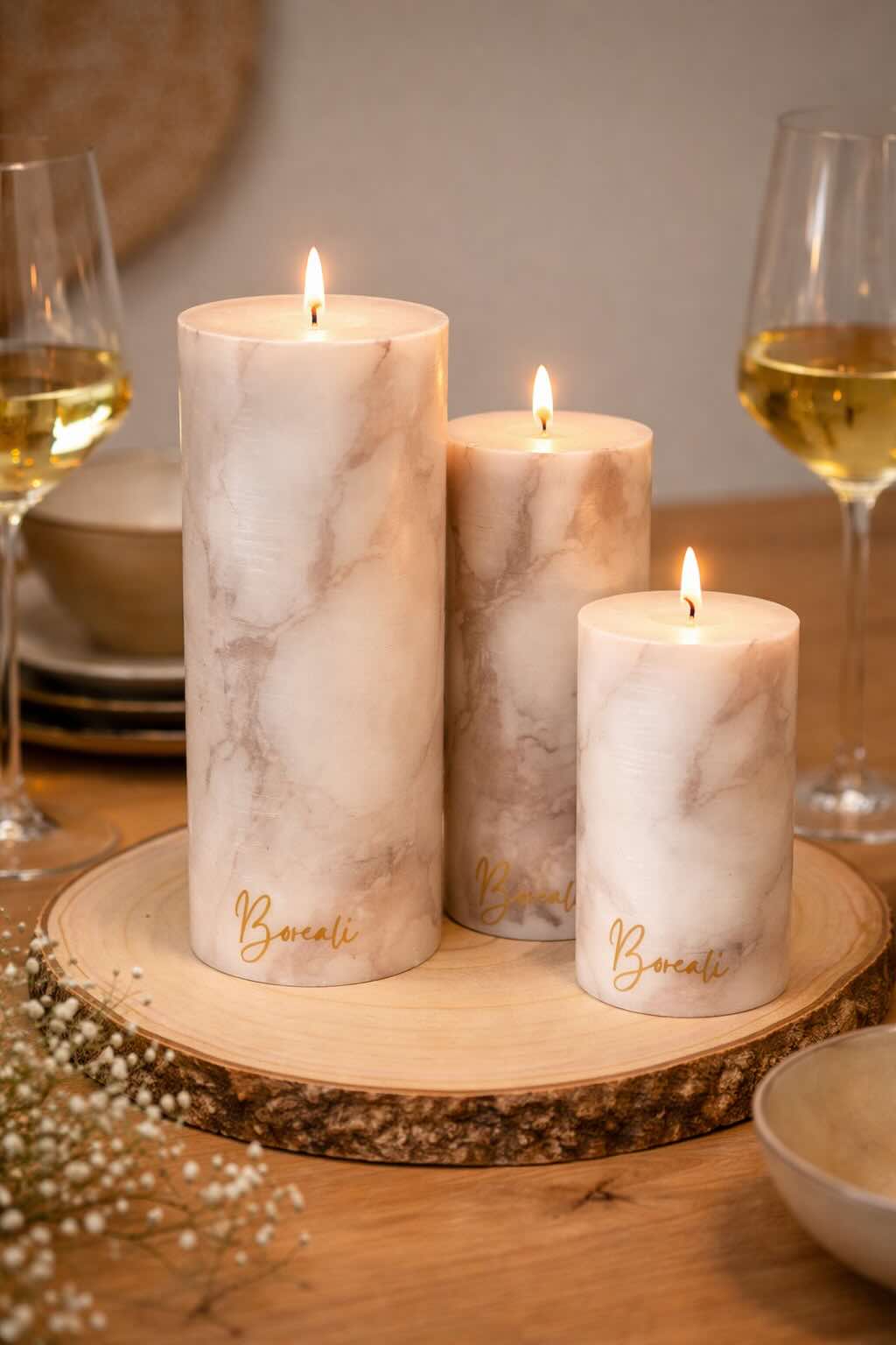Vierkante kaars (binnenkant wit) met rondom bruin marmerlook(100% stearine), maakt uniek kantwerk aan de buitenkant.