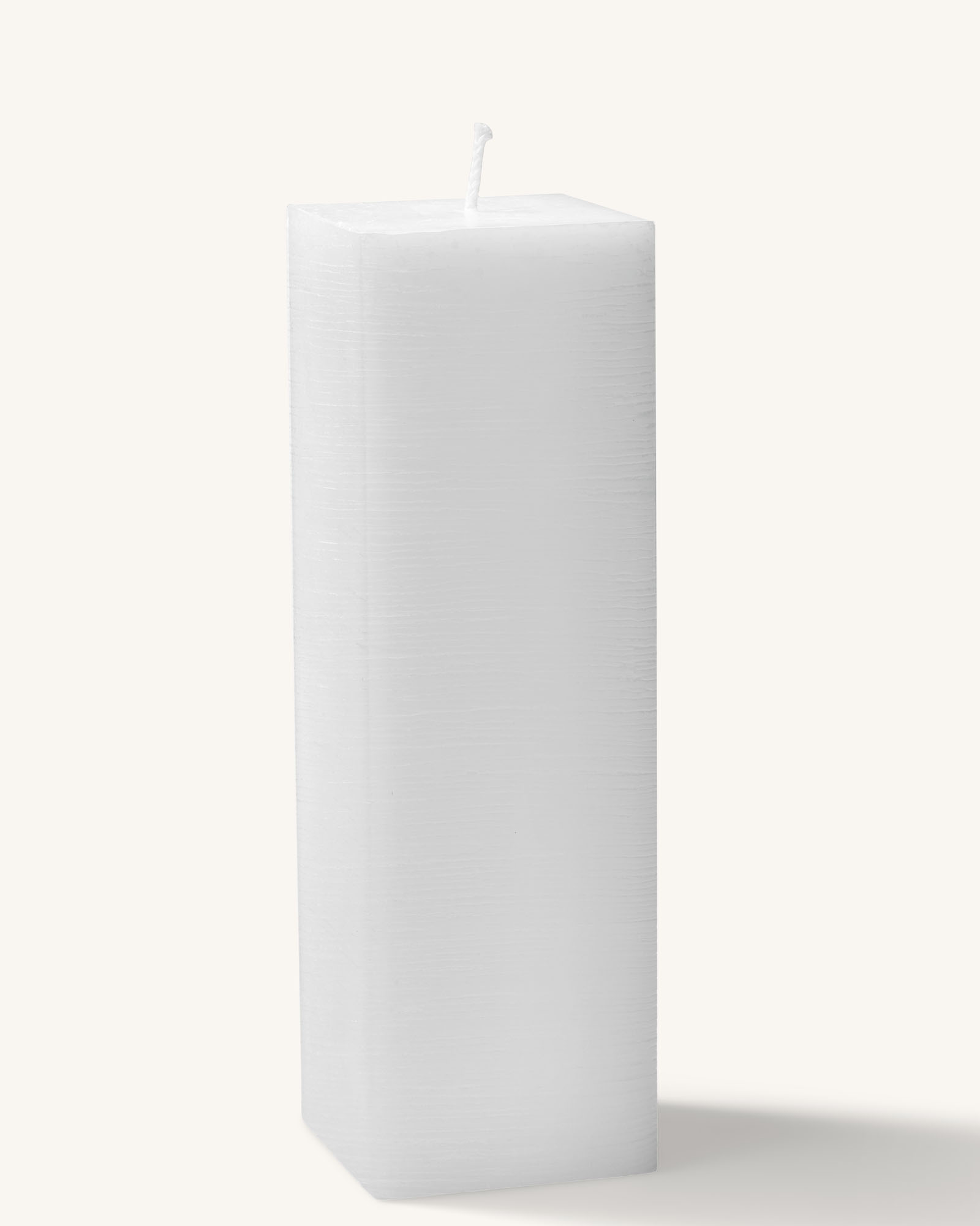 Vierkante kaars wit (100% stearine), maakt uniek kantwerk aan de buitenkant.