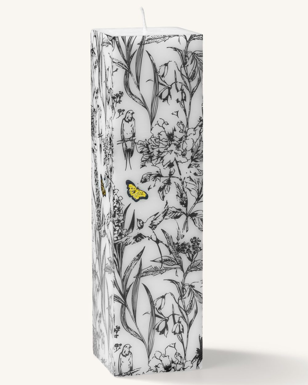 Vierkante kaars wit met prachtige zwarte print (100% stearine), maakt uniek kantwerk aan de buitenkant.